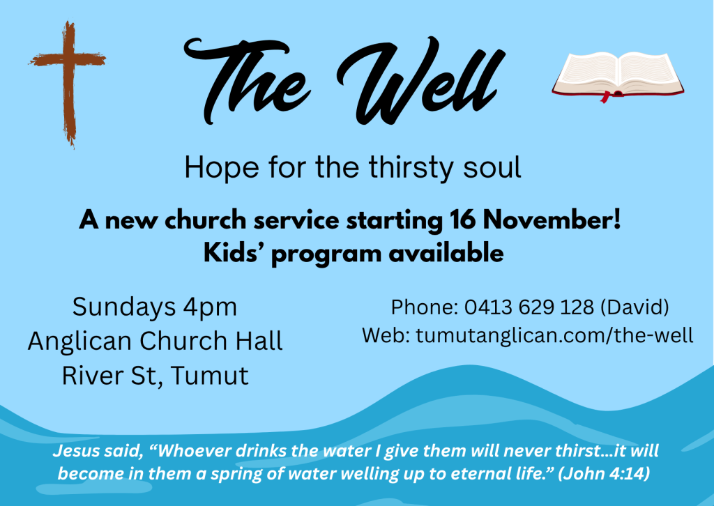 4pm every Sunday at the Parish Hall (across the road from All Saints’ Church, River St, Tumut).
